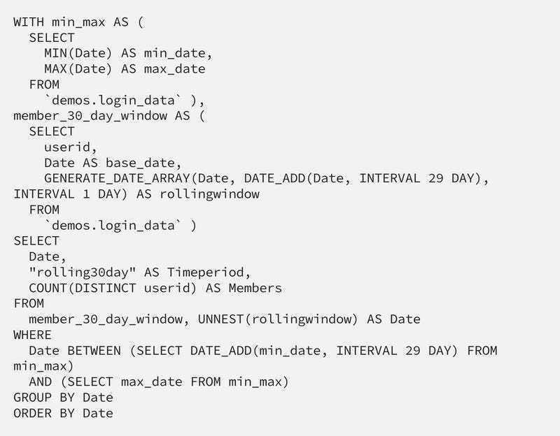 1. Generate a new column from the Date column, which contains an array of the next 30 days (for calculating monthly active users): GENERATE_DATE_ARRAY(Date, DATE_ADD(Date, INTERVAL 29 DAY), INTERVAL 1 DAY).